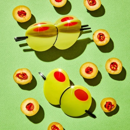 Olive your hair dreams coming true! Featuring two martini olives on a toothpick with bright red pimento details, this playful hair claw is perfect for cocktail enthusiasts and olive lovers alike. Handmade and hand-painted from plant-based, plastic-free cellulose acetate, it measures 4" x 2" with unique color variations. Whether you’re shaken, stirred, or simply styled, this clip adds a fun twist to any look!