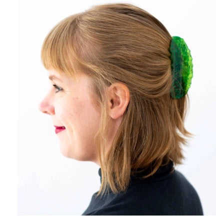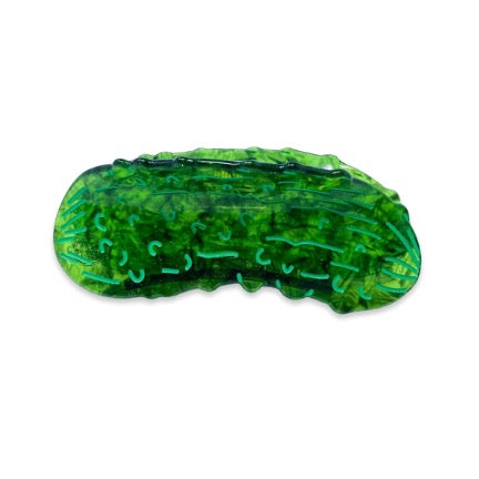 This pickle hair claw packs a punch of tangy style! Get a grip on your 'do with this pickle-shaped hair clip made from cellulose acetate, a plant-based replacement for plastic. Plus it makes the perfect stocking stuffer or gift! Each hair accessory is made from cellulose acetate pieces that are individually cut and hand-painted, which can result in slight variations. That's what makes it unique!