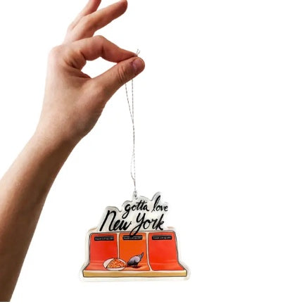 We think it's so funny , with our "pigeon seating only" pizza on the subway ornament. That's a mouthful. But honestly, this might be our favorite ornament from the new collection this year. Perfect for a New York lover, pizza lover, subway lover, or pigeon lover haha. You get it. Printed on 100% recycled laser-cut acrylic.